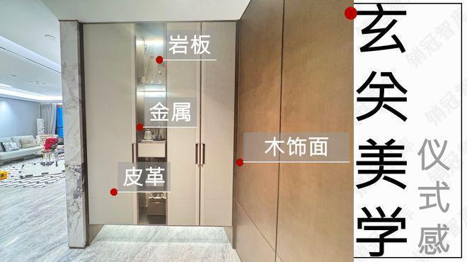 玄关墙也是影壁墙,仪式感拉满,木饰面+皮革饰面+岩板+金属条装饰,保证质感的同时,拉升审美。