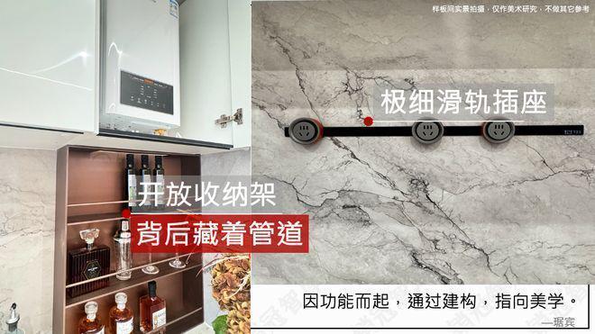 厨房滑轨插座也常见,但做成极细滑轨插座的少;开放收纳架本就不多,颐海澐颂还考虑到利用收纳架,藏起管道,真正做到: