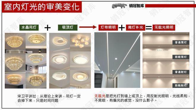 高端产品室内灯光其实是有自己的变迁的,从最初很浮华的水晶吊灯,到后来无主灯设计,做线性灯带+筒灯照明。